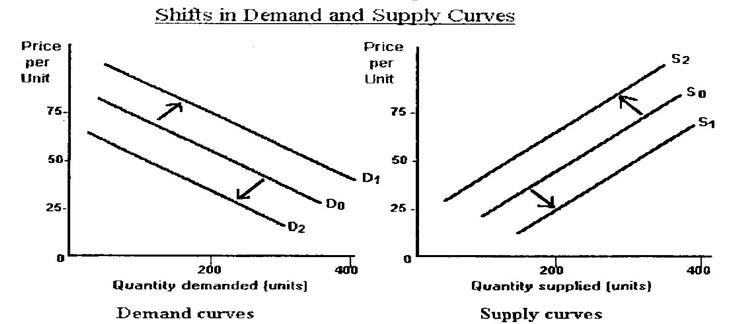 Means that a greater or lesser number of units is bought without changing price. This means a shift in the demand curve. If it shifts up and to the right, a greater number of units is demanded at any given price. If it shifts down and to the left, a lesser number of units is demanded at any given price. Click here for an excellent video overview!